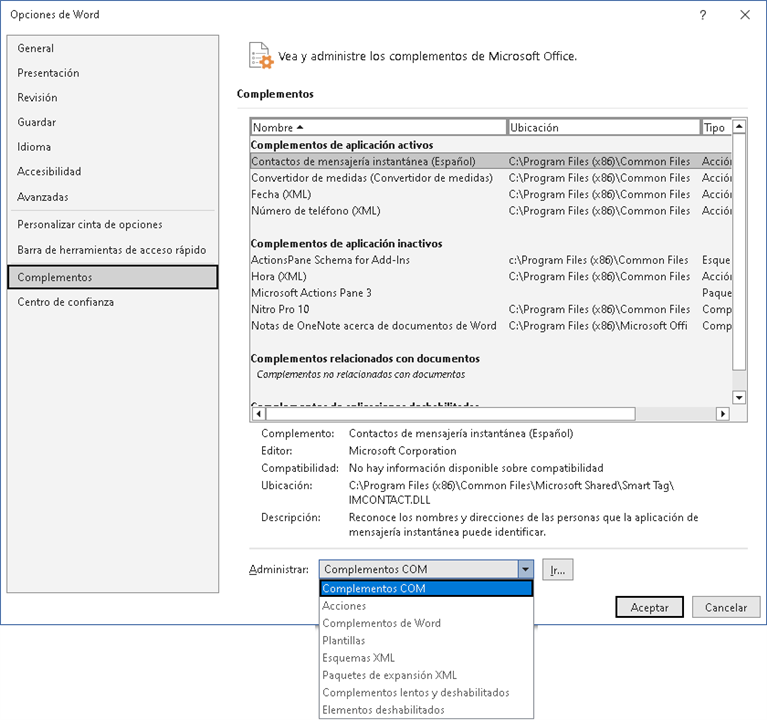 En este paso iremos a la pestaña Complemento, donde debemos usar estas opciones del desplegable Administrar