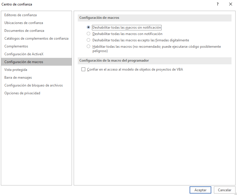La segunda modificación es en la pestaña de Configuración de macros, donde debemos tener habilitada la primera opción llamada "Deshabilitar todas las macros sin notificación", tal y como se muestra en la siguiente captura: