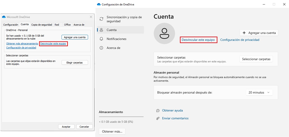 3. En la ventana que se muestra accederemos a la pestaña Cuenta donde encontraremos el botón Desvincular este equipo. Tenga en cuenta que en función de la versión de Office la ventana que se muestra puede ser diferente, no obstante, el botón seguirá estando presente. A continuación podrá ver dos imagenes de diferentes versiones de OneDrive: