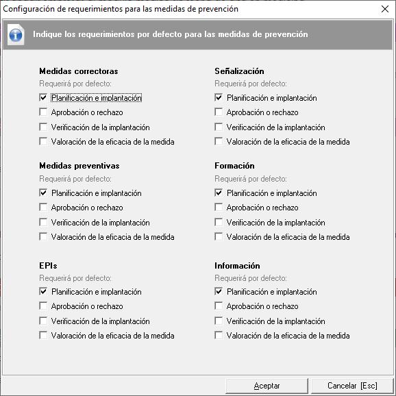 Se permite establecer distintos requerimientos según el tipo de medida (medidas correctoras/preventivas, EPIs, formación, información y señalización) de la planificación de la acción preventiva y se aplica a la planificación preventiva de todos los elementos evaluables: evaluaciones, accidentes/incidentes, no conformidades y partes de inspección.