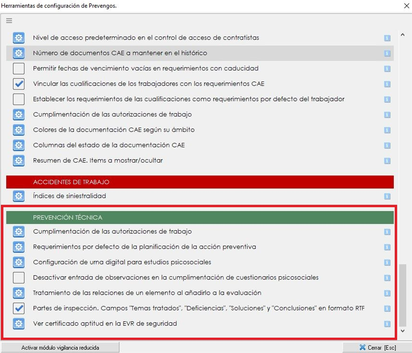En el bloque PREVENCIÓN TÉCNICA dispone de las opciones de configuración que se detallan a continuación: