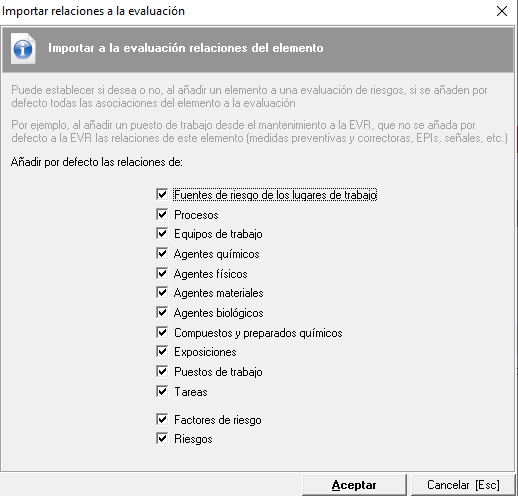 Al añadir un elemento evaluable a una evaluación se añadirán las relaciones predefinidas en el mantenimiento si usted lo decide en esta configuración. Por ejemplo, al añadir a una evaluación un Puesto de trabajo (elemento de evaluación) "Administrativo" que tiene en el mantenimiento relacionado un riesgo "Fatiga visual" (relaciones predefinidas), se añadirá el riesgo automáticamente a la evaluación si está marcada la opción "Puestos de trabajo" de esta configuración.