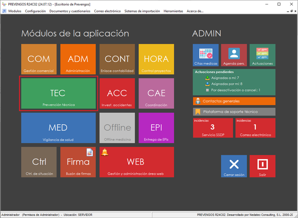 Cuando acceden a Prevengos visualizan el escritorio de la aplicación en el que se encuentran accesos directos a todos los módulos de la aplicación. Entre estos accesos directos se encuentra el del módulo técnico, representado por un rectángulo de color verde con las siglas 'TEC' que les da acceso a este módulo. En este manual vamos a realizar una introducción general de este módulo.
