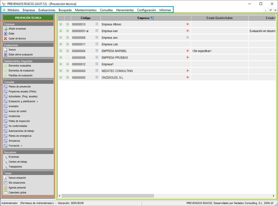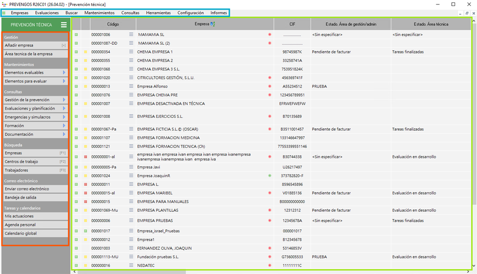 En la parte superior, destacado dentro de un cuadro azul dispone de la barra de menús desplegables, en la parte central destacado con un cuadro verde dispone del listado de empresas que se han incorporado en el módulo técnico y en la columna lateral izquierda destacado con un cuadro naranja dispone de accesos directos a gestión de empresas, mantenimientos, consultas, buscadores, herramientas e informes.