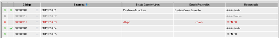En el listado encontrará una serie de columnas con algunos datos de las empresas y algunos iconos que le facilitarán información sobre el estado de las mismas: