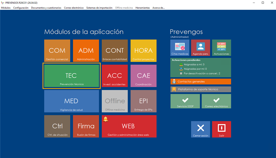 Al acceder a Prevengos, el usuario visualiza el escritorio de la aplicación, desde el que puede acceder a todos los módulos disponibles según la licencia contratada. El módulo de Prevención Técnica se identifica con un rectángulo de color verde con las siglas TEC y constituye el punto de entrada a todas las funcionalidades relacionadas con la actividad técnica preventiva.