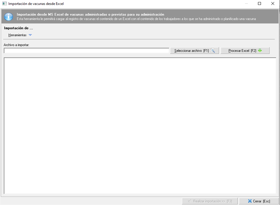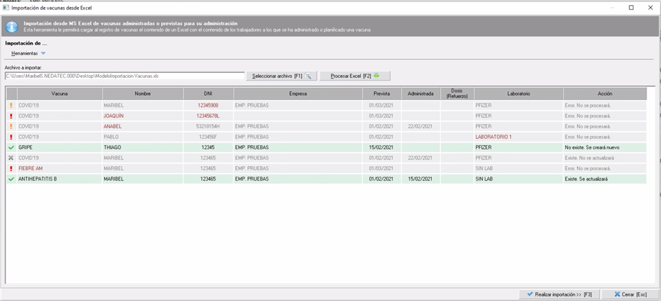 Una vez compruebe que los datos en verde son los que quiere cargar en prevengos, debe pinchar en el botón 'Realizar importación' situado en la parte de abajo derecha de la pantalla y se cargarán los datos en prevengos.