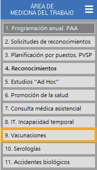 Además, en una consulta médica asistencial dispone de un apartado para registrar la administración de vacunas, según se vayan registrando irán apareciendo en el listado de control de vacunación de la empresa y en la historia clínica de la propia consulta aparecerá la advertencia para añadirla, siempre y cuando tenga fecha de administración (Más información en el manual de historia clinica).