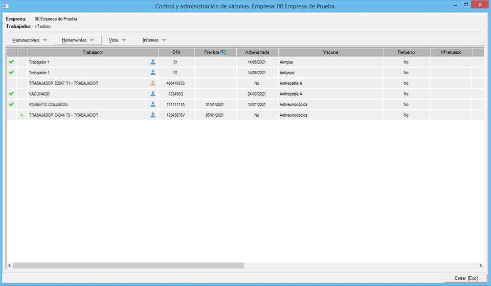 Una vez accedamos a la parte de vigilancia de la salud de una empresa, veremos la herramienta Control de vacunaciones en el menú lateral izquierdo. Una vez entremos, nos saldrá un listado con el historial de vacunas registradas a los trabajadores de la empresa, similar a esta imagen: