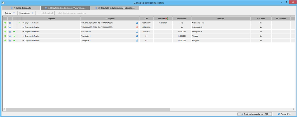 En esta consulta podemos filtrar por una empresa y tendremos 2 resultados, uno nos dará las vacunas administradas y el otro los trabajajadores. Desde la primera pestaña podremos crear registros de vacunaciones en el desplegable Edición