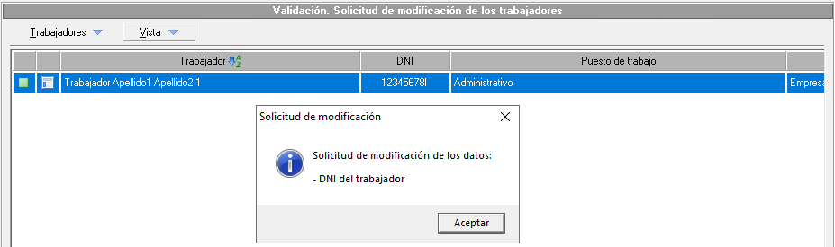 En este caso podrá ver los datos que le han solicitado modificar desde la web. Haciendo doble click o pulsando sobre el desplegable "Trabajadores" podrá ver los cambios solicitados.