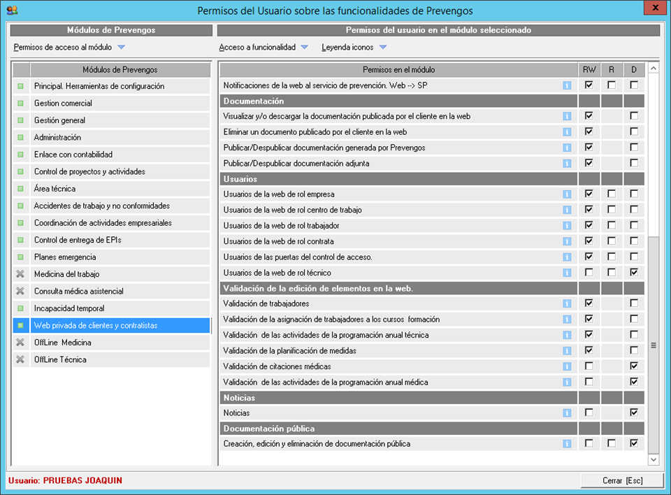 Para que técnico de prevengos pueda validar los datos ha de tener habilitados los permisos del bloque "Validación de la edición de elementos en la web" para el módulo "Web privada de clientes y contratistas".