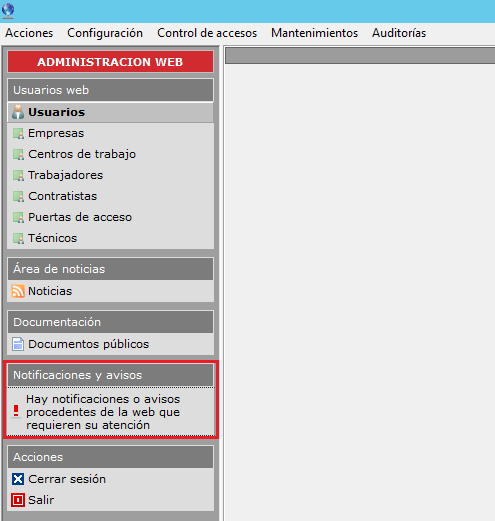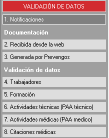 Al pulsar sobre este icono abrirá el formulario "Prevengos. Administración de la WEB de clientes" que pinchando en "Notificaciones y avisos" da acceso formulario "Notificaciones procedentes de la web" que permite gestionar los datos introducidos desde el portal web.