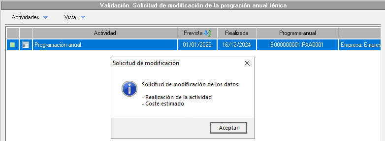 Validar o rechazar la realización de actividades del programa anual técnico con el menú "Actividades".