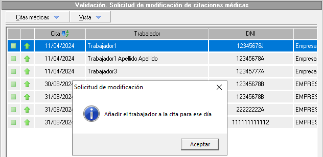 Validar o rechazar la adición o eliminación de trabajadores de la agenda de citaciones con el menú "Citas médicas".