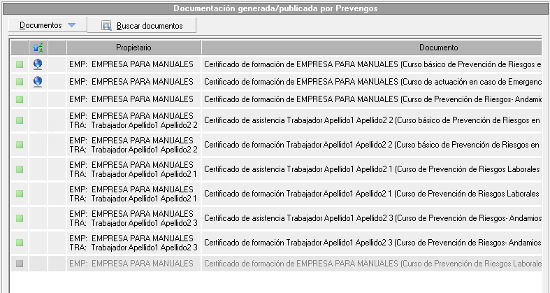 Consulte los documentos generados por Prevengos en esta pantalla para poder saber si están publicados. La primera columna indica si el documento está activado y la segunda si está publicado
