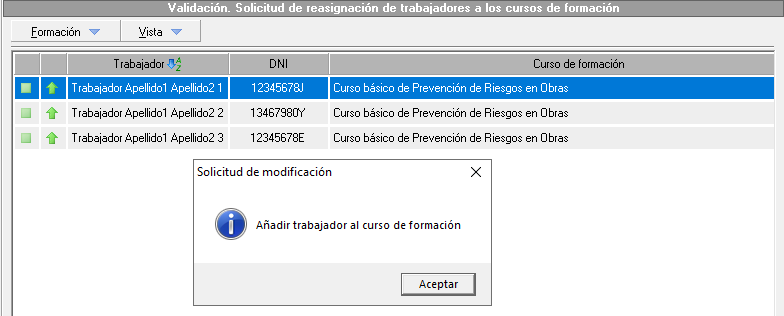 Validar o rechazar la adición o eliminación de trabajadores de las acciones formativas con el menú "Formación".