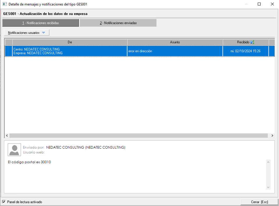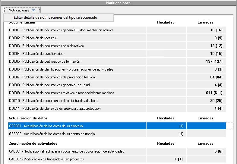 En esta pantalla verá un resumen de las notificaciones enviadas o recibidas de de la web. Podrá ver el datalle de cada una de ellas.