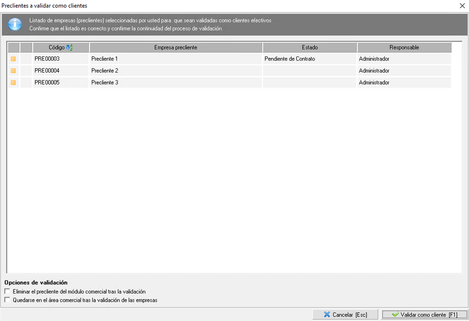 Esta opción, le llevará al asistente de validación donde aparecerán todas las empresas que va a validar como clientes. En la parte inferior se le muestran dos Opciones de validación adicionales "Eliminar el precliente del módulo comercial tras la validación" o "Quedarse en el área comercial tras la validación de las empresas".