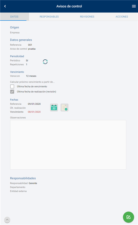 En la pestaña DATOS podemos ver el origen del aviso de control, los datos generales, la periodicidad del mismo, vencimiento, fechas de referencia, observaciones y responsabilidades. La Webapp nos da la opción de editar directamente desde la propia web todos los datos que vemos en pantalla, para ello hacemos clic sobre el boton