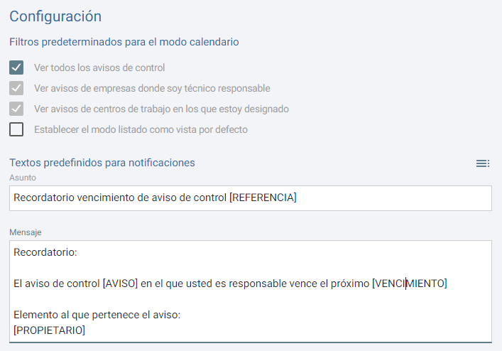 Encontrarán dos partes principales de configuración, por un lado la configuración de filtros y por otro los textos de notificaciones. Los filtros que pueden aplicar son los relacionados con aquellos avisos que podrán ver (todos, de empresas donde el usuario es responsable o en avisos en los que esta designado). Otra de las configuraciones editables será la de indicar si al acceder a los avisos de control se mostrará el modo calendario o el modo listado (por defecto esta el calendario).