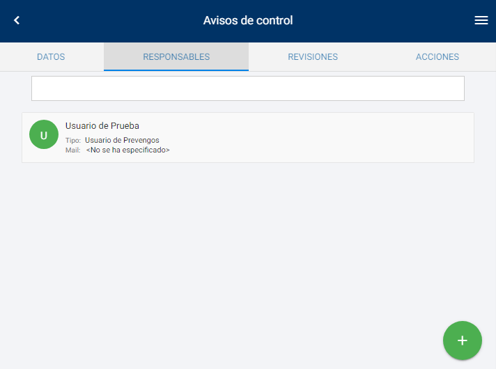 Donde podemos ver una lista de los usuario y/o trabajadores responsables del aviso de control. Con el icono situado en la parte inferior derecha