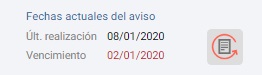 En este apartado nos informa de la fecha de última realización y del vencimiento, si hacemos clic al icono situado a la derecha tenemos disponible dos opciones relacionadas con deshacer la realización del aviso: Deshacer última realización o deshacer todas las realizaciones hasta esta. Si por ejemplo el aviso de control ha sido renovado 5 veces y estamos en la ficha de la segunda renovación, con la segunda opción eliminaremos las 3 últimas renovaciones.