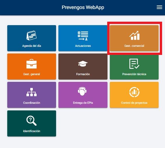 Dentro de este manual nos vamos a centrar en el módulo comercial de la webapp, en concreto el que tenemos seleccionado en la siguiente imagen: