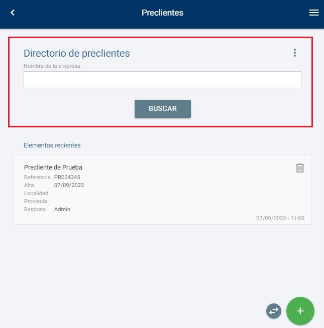 Debajo del buscador, encontramos el apartado de 'Elementos recientes', donde podremos ver los últimos preclientes a los que hemos accedido.