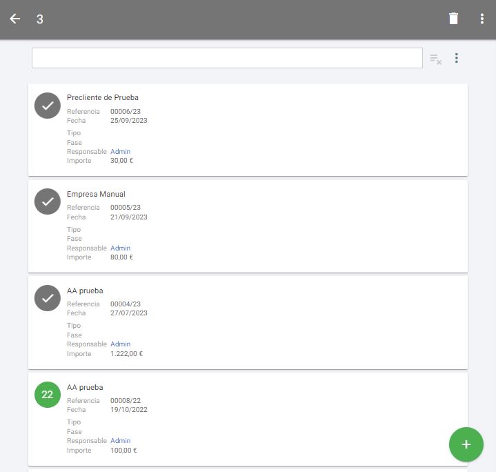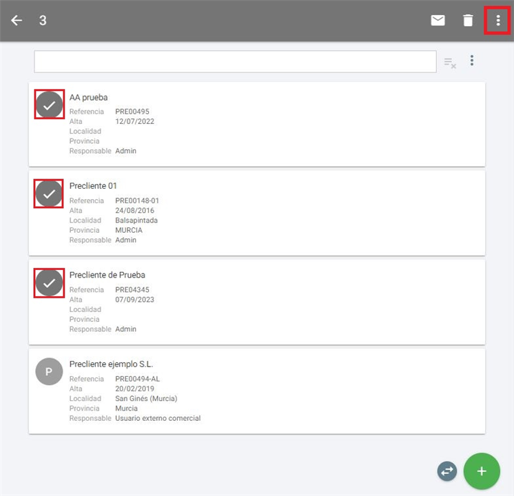 Esta opción de selección masiva existe en diferentes sitios de la webapp, en este caso nos permite elegir varios preclientes con el fin de realizar cambios masivos sobre ellos. Aquellos elementos seleccionados quedaran marcados con el icono