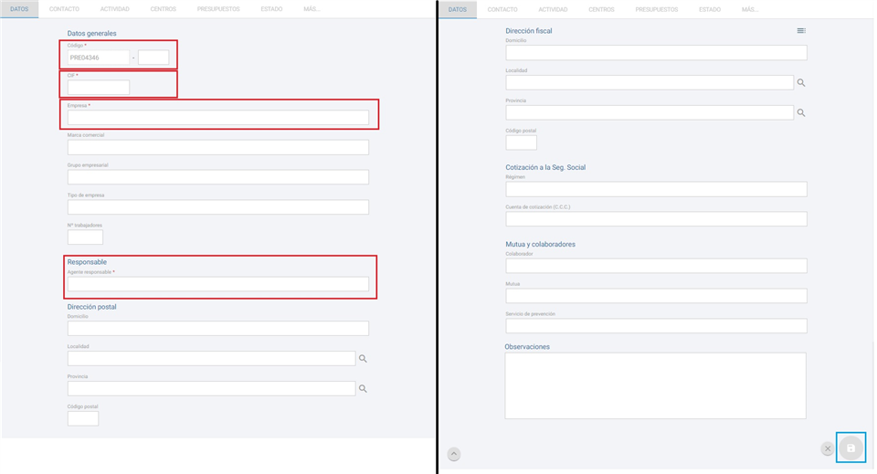 Tras introducir los datos obligatorios y guardar el precliente, se habilitan el resto de pestañas que encontramos. No obstante dentro de esta pestaña de DATOS podemos indicar más datos sobre el precliente (marca comercial, grupo empresarial, tipo de empresa o número de trabajadores), así como indicar la dirección postal y fiscal, datos sobre la cotización a la seguridad social, mutua, colaboradores y cualquier observación sobre la propia empresa.
