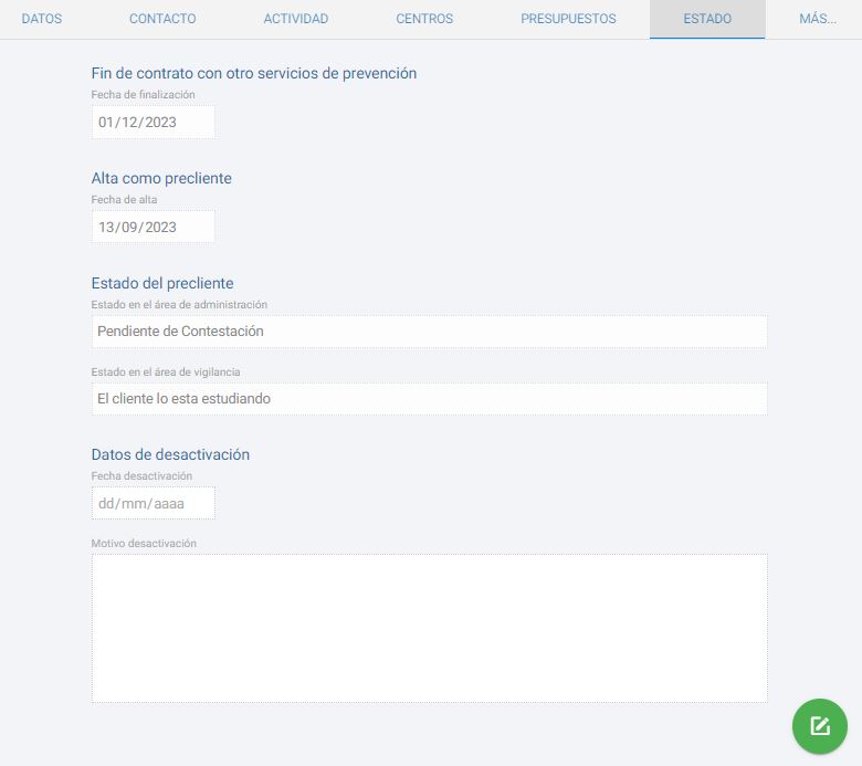 Gestionaremos el estado del precliente en una pestaña similar a la siguiente imagen:
