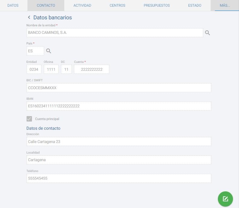 Como podemos apreciar, encontraremos los campos del banco al que pertenece, el código de país, los 20 digítos (entidad, oficina, DC y cuenta), el BIC/SWIFT y el IBAN. Podemos marcar la cuenta como cuenta principal, en caso de que el precliente tenga varias cuentas. En la parte inferior indicaremos los datos de contacto (dirección, localidad y teléfono).