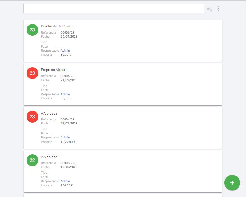 Dentro de esta pantalla, veremos el listado de Presupuestos existentes. En cada registro de cada presupuesto se mostrará un pequeño resumen de los datos del presupuesto y el precliente al que pertenece. Además, en la parte superior, veremos una caja de texto que nos permitirá localizar un presupuesto si escribimos el nombre del precliente al que pertence, o la referencia del mismo.