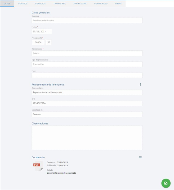 Tras estos dos bloques principales encontramos el correspondiente a las Observaciones del presupuesto y el bloque con los datos del Documento. Sobre este último bloque tendremos disponible el documento una vez lo generemos, para ello tenemos el botón situado a la derecha
