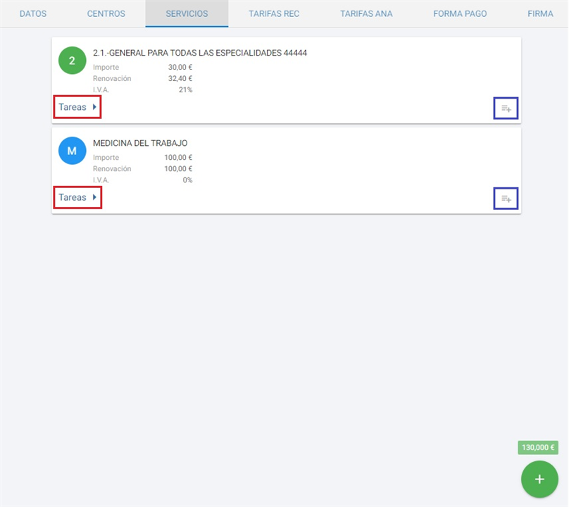 se despliega el listado de tareas incluidas en el servicio, en caso necesario podemos añadir nuevas tareas con el botón