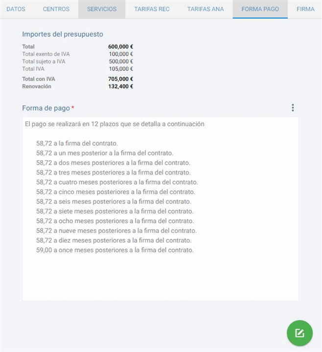 Dentro de esta pestaña podemos configurar la forma de pago en el presupuesto asi como los datos de importes, iva o renovaciones. La pantalla que se muestra es similar a la siguiente imagen: