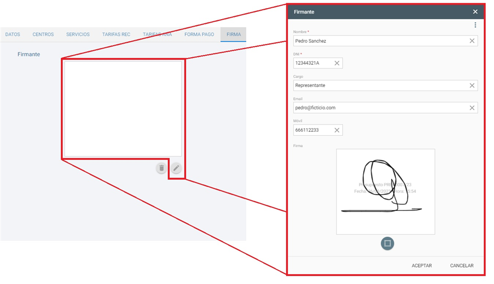 Esta firma que encontramos en el presupuesto es una manera sencilla de recoger el "garabato" del responsable con el fin de poder incluirlo al generar el documento correspondiente al propio presupuestos. Si hacemos clic sobre la parte resaltada en rojo se nos muestra una ventana donde podemos indicar el nombre y dni de la persona que va a firmar, de la misma manera que el cargo que tiene en la empresa, correo electrónico y número de teléfono. Una vez recogida la firma lo veremos de manera similar a la imagen superior.