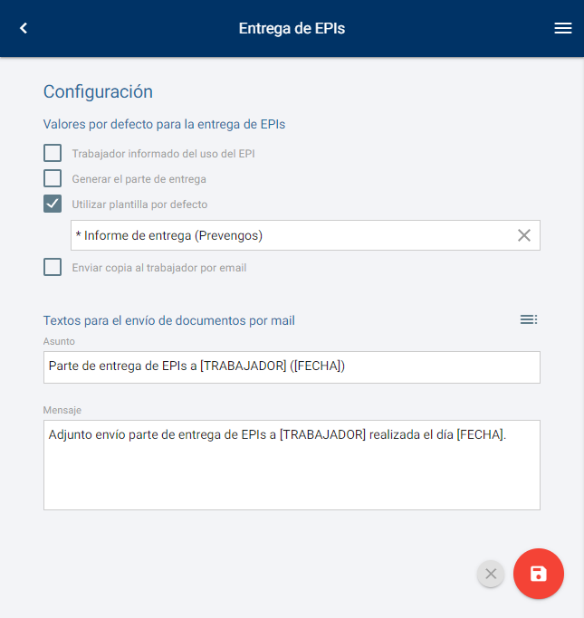 Tal y como vemos, podemos establecer una configuración por defecto para la entrega de EPIs, pudiendo seleccionar que se marque por defecto que el trabajador es informado del uso de EPI, que se genere el parte de entrega con una plantilla de impresión determinada y que se envíe copia al trabajador por email.