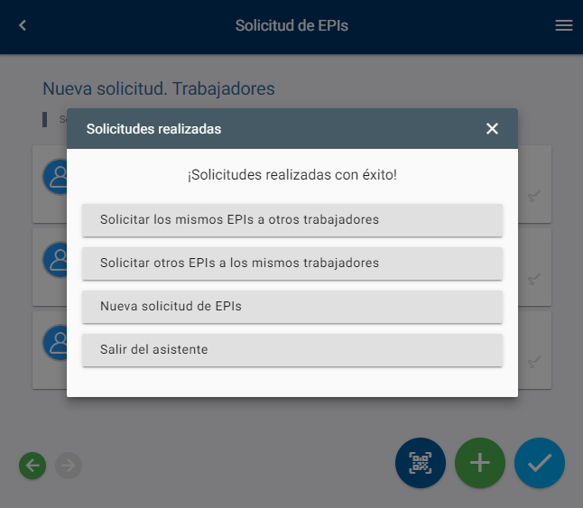 Mediante este asistente, se podrá volver a registrar una nueva solicitud con los mismos datos pero para otros trabajadores, registrar otra solicitud para los mismos trabajadores pero modificando los EPIs, o directamente registrar una nueva solicitud desde 0. Finalmente, se tiene la opción de salir del asistente.