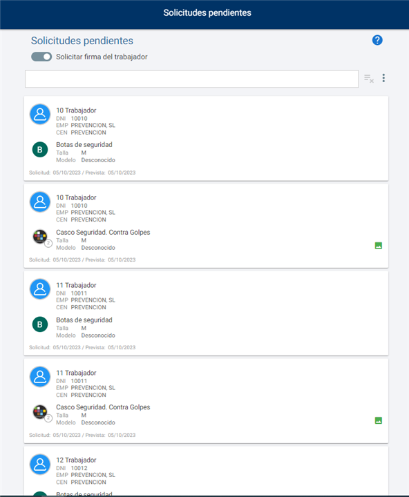 En esta parte superior, también se aprecia la opción de solicitar obligatoriamente la firma del trabajador antes de confirmar la entrega de las solicitudes. Esta firma corresponde realmente al grafo de la firma del trabajador que se puede dibujar en ese mismo instante mediante un dispositivo móvil o tablet, pero no hay que confundirlo con la firma biométrica (o, en su defecto, OTP) del parte de entrega de EPI que es posible hacer con el Módulo de Firma externa.