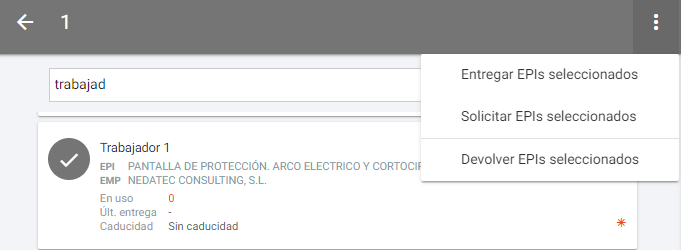 seleccionaremos los EPIs sobre los que se quiera trabajar, con el fin de entregar, solicitar o devolver individual o masivamente:
