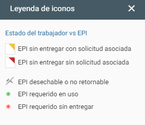 Desde esta herramienta podemos ver un listado de los trabajadores y los EPIs usados/requeridos/solicitados. Tenga en cuenta que podrá diferenciar los EPIs requeridos, de los usados o con solicitud asociada mediante la leyenda de iconos.