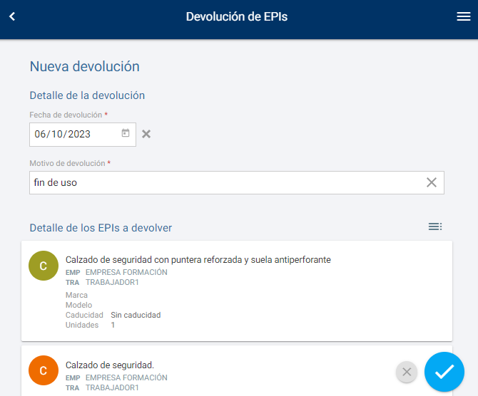 . Desde aquí se indicará el motivo y el detalle de los EPIs a devolver mediante
