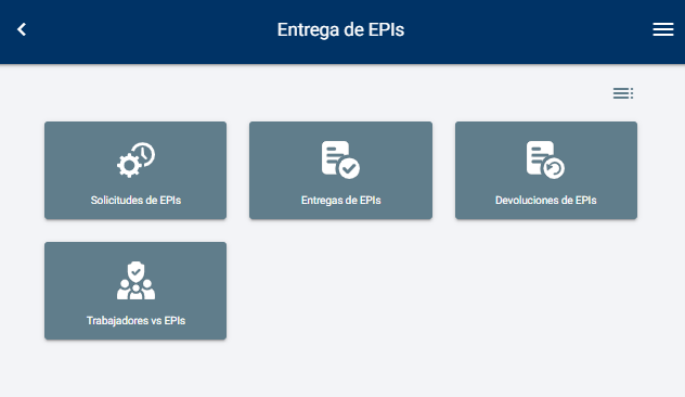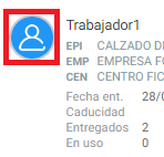 Disponemos dentro de la WebApp de la herramienta para gestionar los elementos de protección individual (EPI) de los trabajadores. Una vez dentro del módulo de entrega de EPIs podremos gestionar nuevas entregas y devoluciones (así como consultar las realizadas en ambos casos) y ver las necesidades de EPIs para los trabajadores. Lo distinguiremos por el siguiente icono: