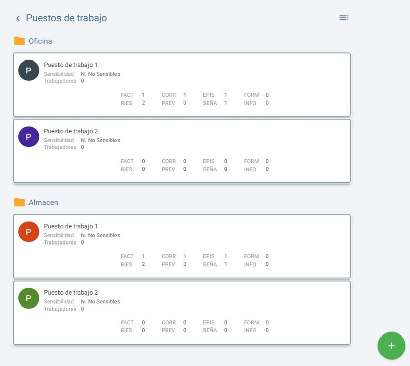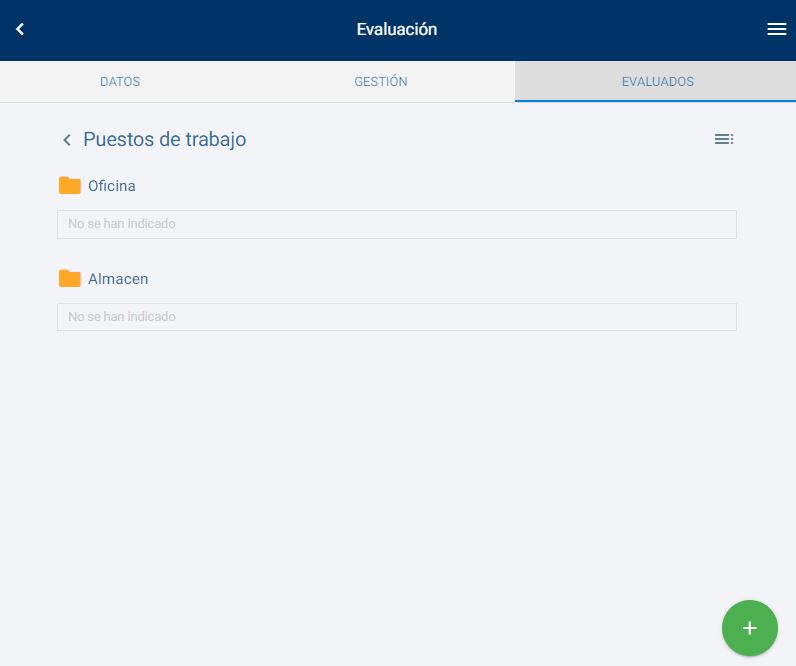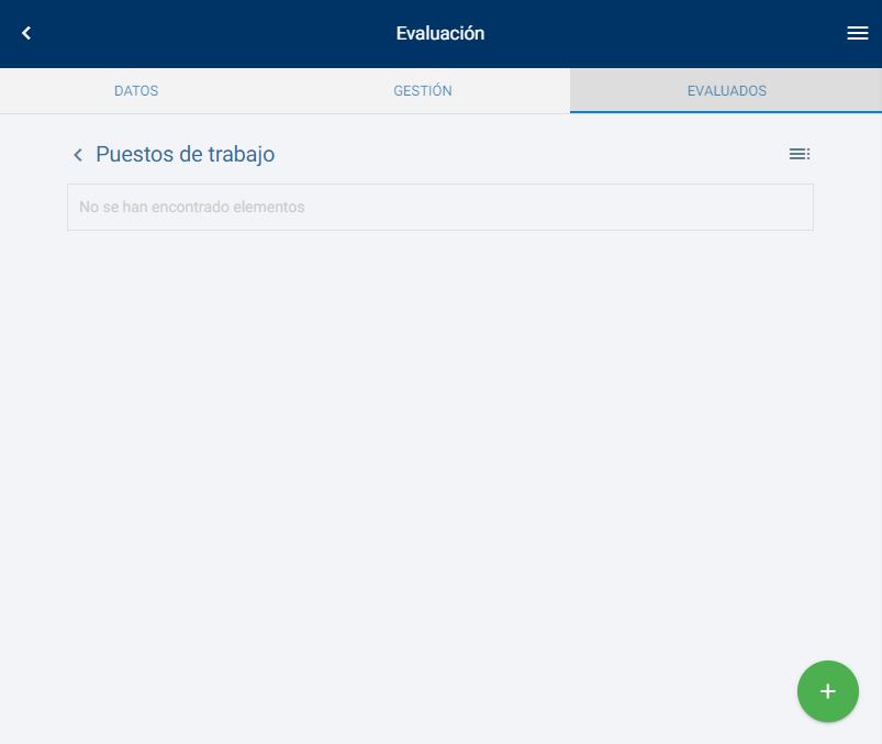 Dentro de este apartado tendremos los puestos de trabajo incluidos en la evaluación, de momento en nuestro caso, no tenemos ninguno todavía. Encontramos dos iconos principales, el primero