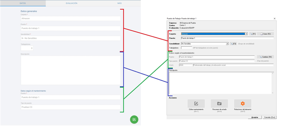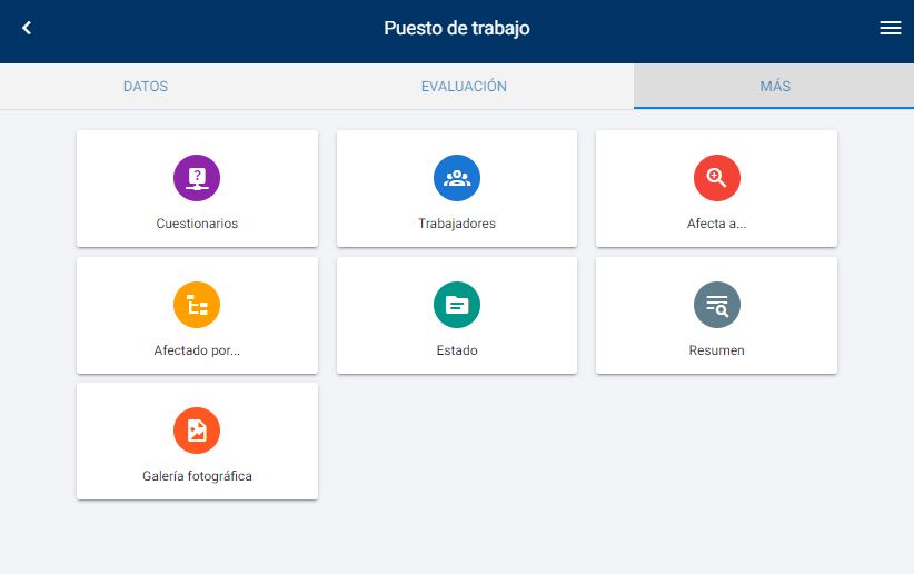 Esta ficha es la que se muestra cuando accedemos a un elemento evaluable (un puesto de trabajo, un equipo,...) donde encontramos 3 pestañas en la parte superior: Datos, Evaluación y Más. En los siguientes apartados trataremos cada una de estas pestañas profundizando en las opciones que nos ofrecen.