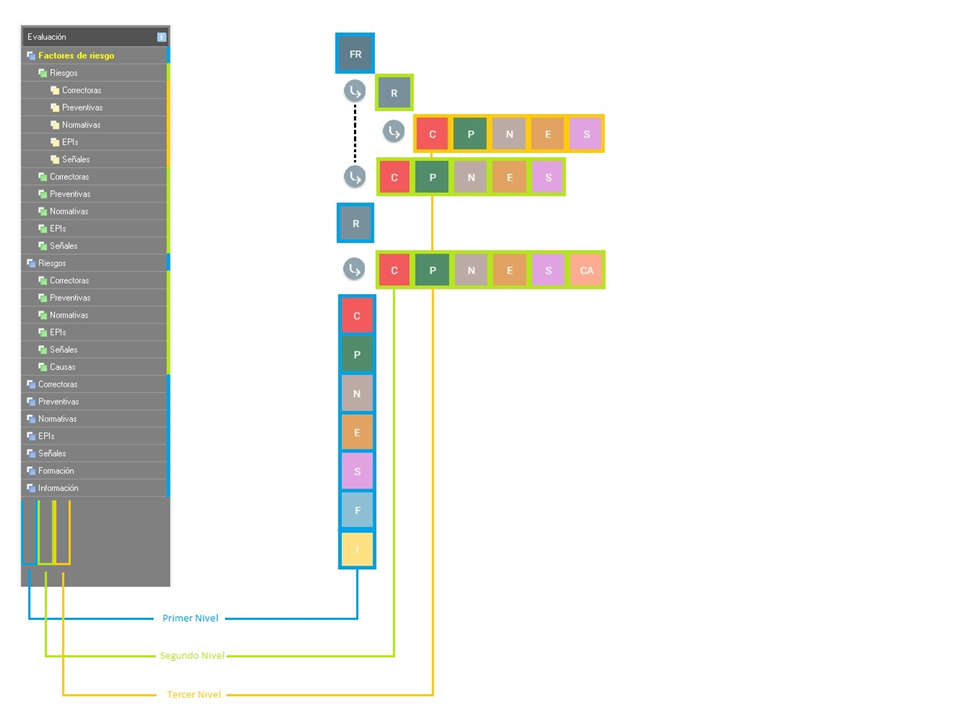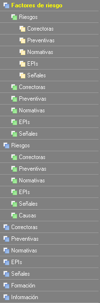 Dentro de este punto, vamos a tratar dos temas. Por un lado la ficha del elemento de evaluación, como puede ser la ficha de un riesgo, de un factor, de una medida,.... Por otro lado vamos a ver los niveles dentro del árbol y como movernos por ellos.