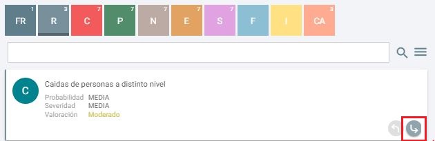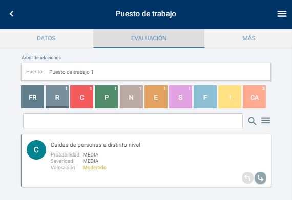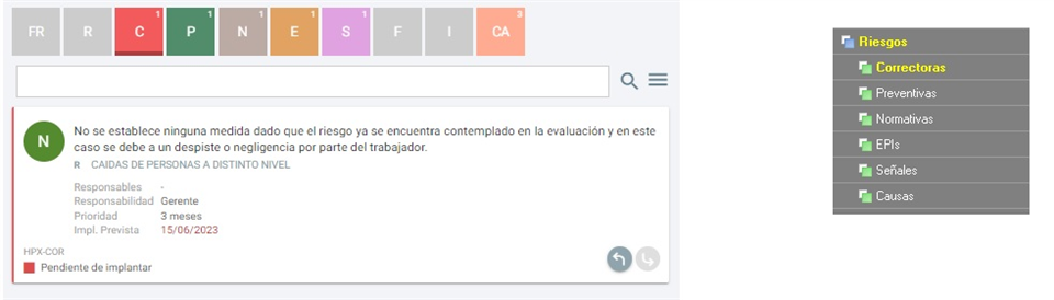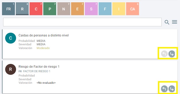 Dentro de estos botones podemos diferenciar los factores de riesgo [FR], los riesgos [R], las medidas correctoras [C], medidas preventivas [P], normativas [N], elementos de protección individual (EPIs) [E], señales [S], formación [F], información [I] y las Causas [CA].