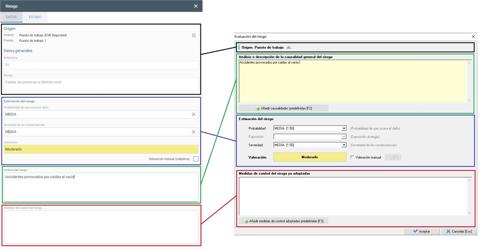 - Riesgos. La ventana que se muestra es la misma tanto para riesgos asociados a factores como para aquellos que están directamente vinculados al elemento. En ella podemos ver los datos del origen, valorar el riesgo en función del método de evaluación indicado en la propia evaluación, establecer el análisis del riesgo y las medidas de control del riesgo. En la siguiente imagen podemos ver el símil de Prevengos con la Webapp, donde apreciamos que los campos son los mismos: